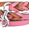 Beautifully designed with two tone pink and light pink padded handle. This genuine 6 foot leather lead is made from some of finest leather available on the market. Each 6 foot leash is handmade with attention to every detail. This leather leash will only get better as time goes on. At six feet long this leash makes for the perfect training lead for large and medium dogs. Our leather leashes are braided by hand to offer superior strength, durability, comfort and able to handle the weight of your dog. It also gives your dog room to roam on walks or runs.